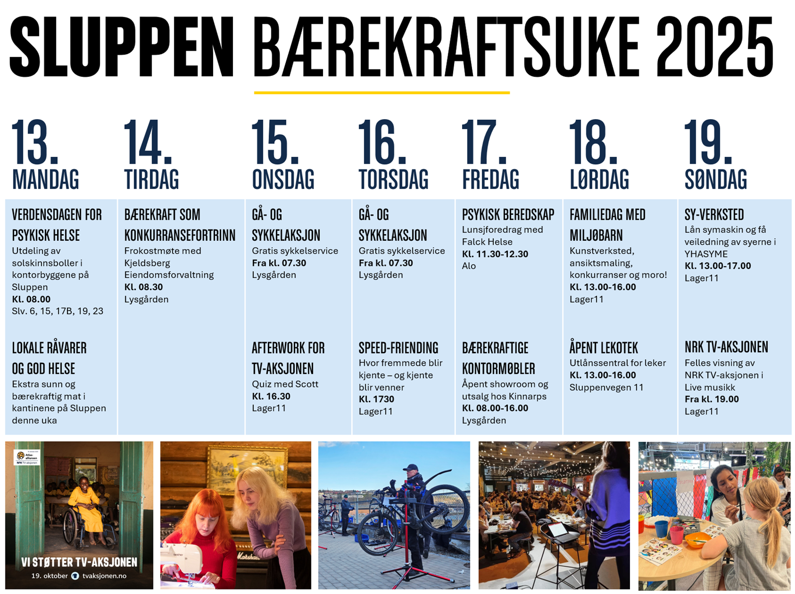For 5. året dedikeres uke 42 til bærekraftsuke på Sluppen. Denne uka er det ekstra fokus på bærekraft i vid forstand, med arrangementer og aktiviteter på Sluppen. Bærekraftsuka arrangeres av R. Kjeldsberg sammen med gode samarbeidspartnere på Sluppen.